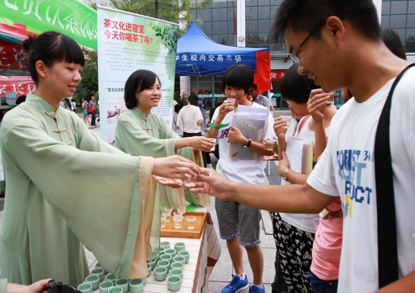 在現(xiàn)場(chǎng)的飲茶體驗(yàn)點(diǎn),來自該校茶文化專業(yè)的同學(xué)展示著茶藝、沖泡一壺壺安吉白茶供往來的學(xué)生及家長(zhǎng)品飲,發(fā)放倡議書、大力宣傳飲茶能帶給同學(xué)們的一系列好處,倡導(dǎo)同學(xué)們形成飲茶習(xí)慣。此次免費(fèi)飲茶體驗(yàn)點(diǎn)的活動(dòng)由文化學(xué)院發(fā)起,由大學(xué)生茶文化協(xié)會(huì)的同學(xué)全程組織參與,聯(lián)合了大學(xué)生自主創(chuàng)業(yè)基地中國(guó)茶謠·茶文化創(chuàng)業(yè)產(chǎn)業(yè)園以及校企合作單位安吉千道灣·恒盛白茶有限公司提供茶葉,現(xiàn)場(chǎng)為2012級(jí)新生及家長(zhǎng)贈(zèng)飲安吉白茶、提供茶文化的體驗(yàn)機(jī)會(huì)。