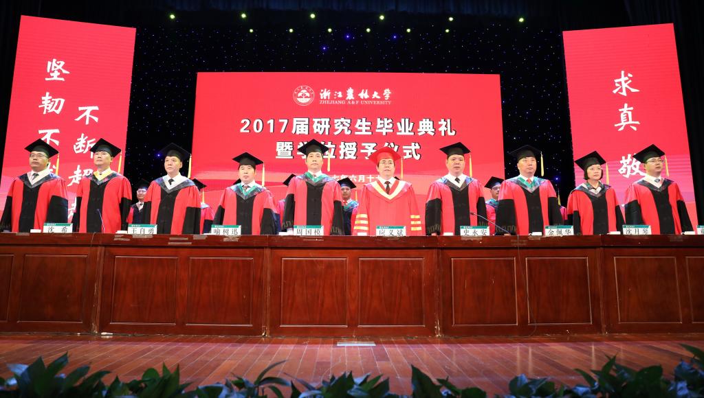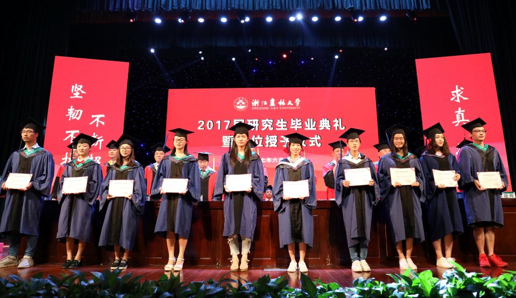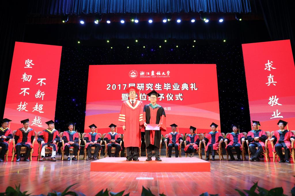 3名首屆博士畢業生,496名碩士畢業生按學院依次上臺,校長應義斌為每一位畢業研究生頒發學位證書、扶正流蘇,并合影留念。相關學院院長和研究生導師見證了學位授予儀式。