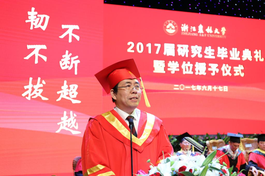 校長應義斌作題為《做一個受人尊重的人》的講話。他向圓滿完成學業的3名博士研究生以及543名碩士研究生表示最熱烈的祝賀,向多年來為同學們的成長含辛茹苦、任勞任怨的父母,默默耕耘、勤勉奉獻的老師們致以最衷心的感謝和最崇高的敬意。