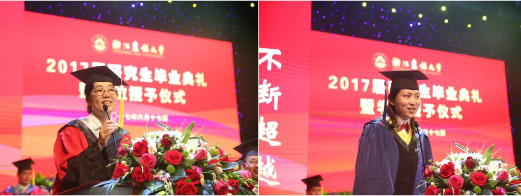 沈希宣讀《浙江省教育廳辦公室關于公布2017屆浙江省普通高等學校優秀畢業生名單的通知》等表彰文件。校領導為25名省級優秀畢業研究生、1名校級優秀博士學位論文作者、19名校級優秀碩士學位論文作者頒發榮譽證書。