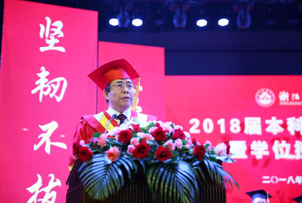 今天,你們身著意義非凡的學位禮服,心中深藏對母校的深情與眷戀,滿懷對未來的憧憬與向往,為自己的大學時光畫上了一個圓滿句號,也將正式開啟人生一段嶄新的旅程。當你們走上臺前、扶正流蘇,請不要忘記臺下那一雙雙飽含欣慰與期望的眼神:來自于為你們竭盡心力、誨人不倦的良師益友,還有為你們含辛茹苦、牽腸掛肚的父母至親,他們和我一樣,為你們今時今日已然蝶變成為一個擁有獨立人格和健全心智的人而感到無比驕傲與自豪!在此,我首先代表學校向2018屆3790名本科畢業生表示最衷心的祝賀!同時,在這樣一個難忘的時刻,我也要提議大家用熱烈的掌聲向養育你們的父母、培養你們的老師、幫助你們的同學致以最誠摯的感謝!