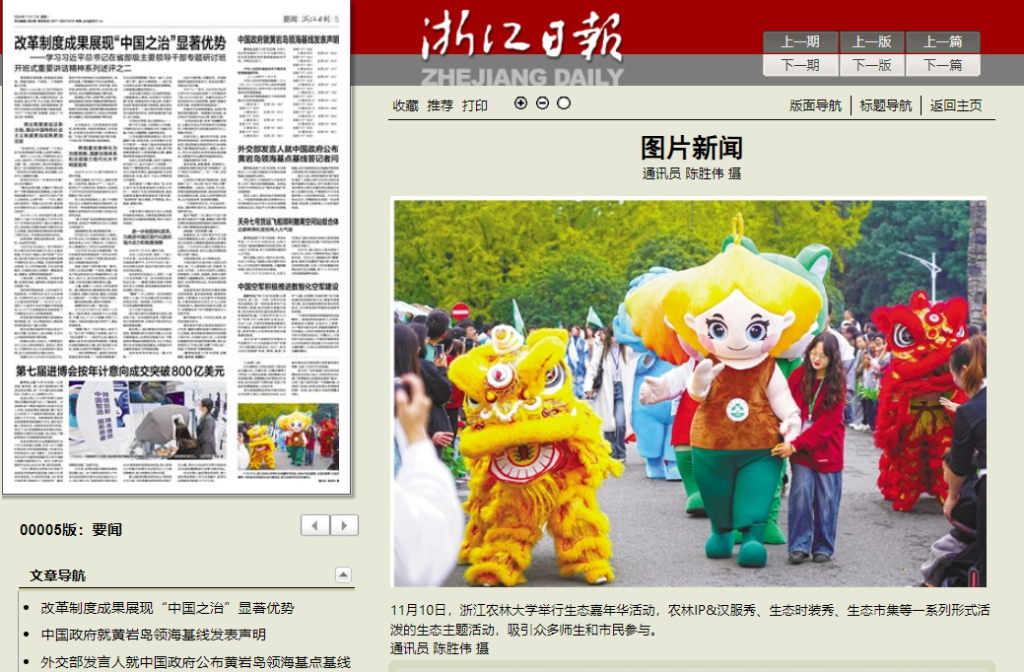 11月10日,浙江農林大學舉行生態嘉年華活動,農林IP&漢服秀、生態時裝秀、生態市集等一系列形式活潑的生態主題活動,吸引眾多師生和市民參與。
