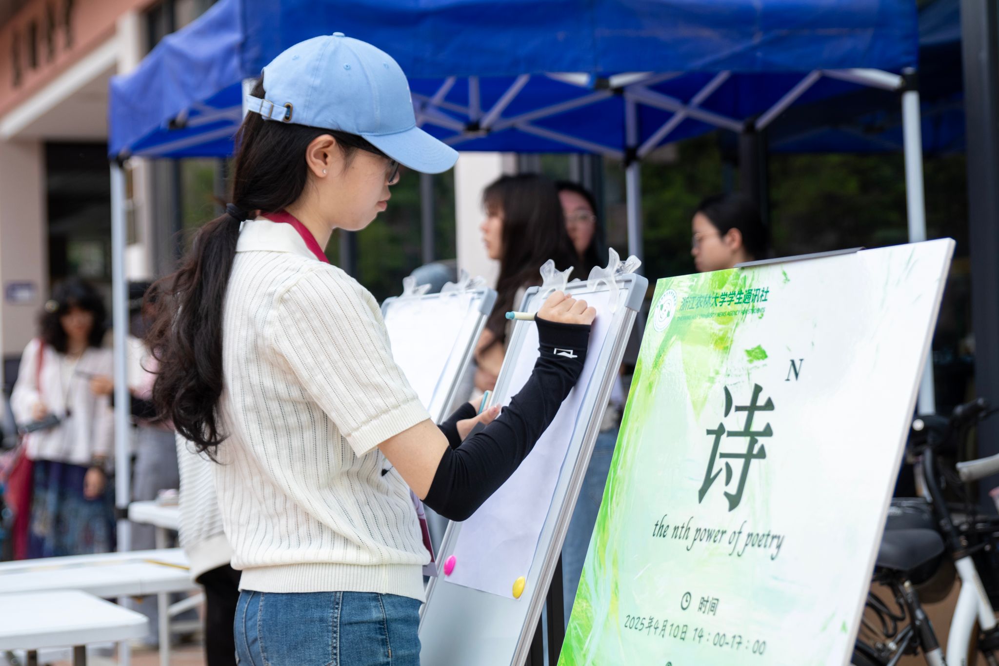 4月10日,“詩的N次方”詩歌征集活動在東湖食堂門口舉行。此次活動由浙江農林大學學生通訊社主辦,浙江農林大學林莽文學社、書法協會協辦。