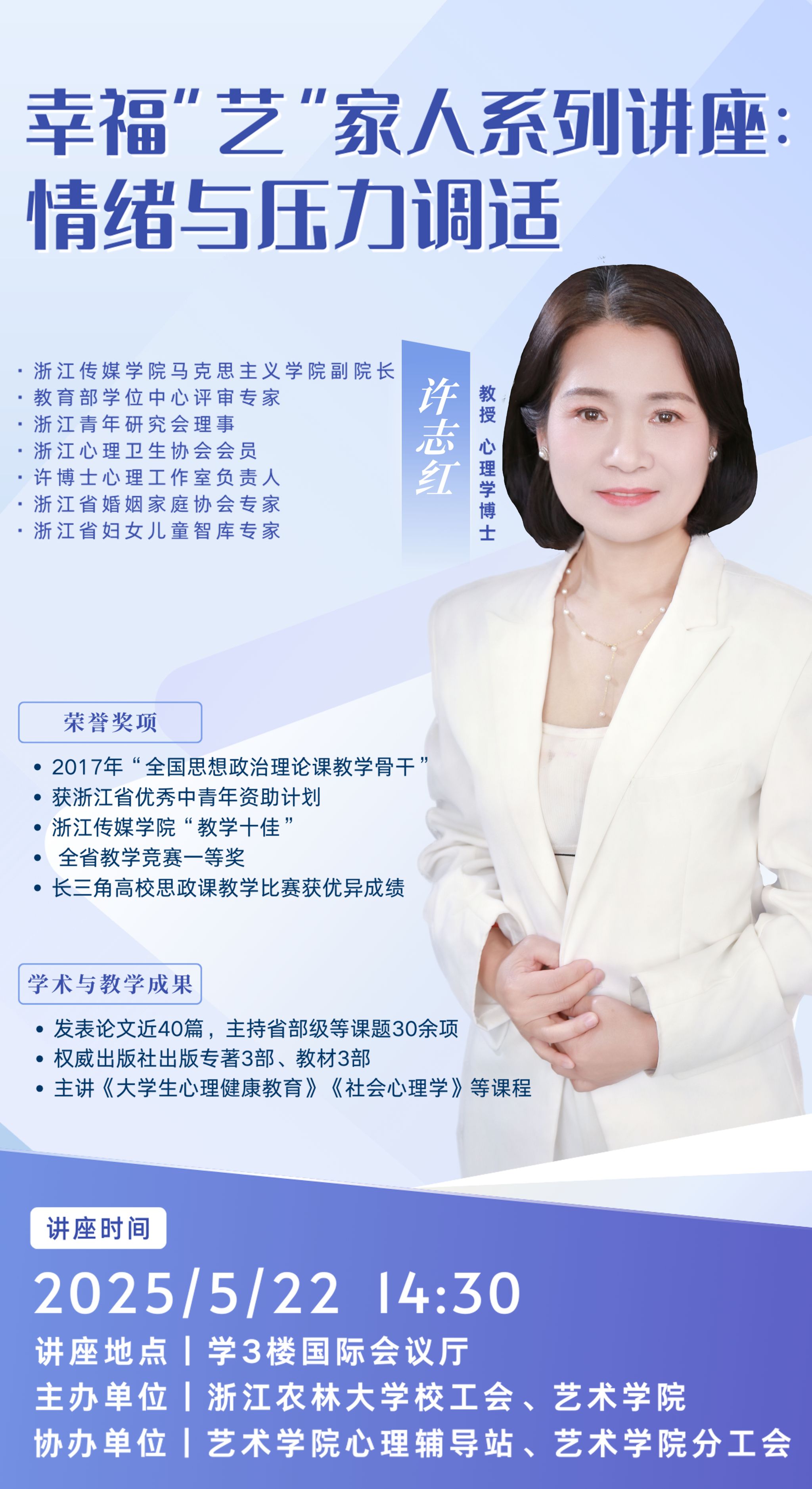 主講人簡介:許志紅,教授,心理學博士。浙江傳媒學院馬克思主義學院副院長,教育部學位中心評審專家,浙江青年研究會理事,浙江心理衛(wèi)生協(xié)會會員,許博士心理工作室負責人,浙江省婚姻家庭協(xié)會專家,浙江省婦女兒童智庫專家。研究方向為社會心理學。在學術期刊發(fā)表論文近40篇,主持省部級等各類課題30余項。在權威出版社出版3部專著,編寫3部教材。長期從事《大學生心理健康教育》、《社會心理學》等課程的教學工作。曾獲得2017年“全國思想政治理論課教學骨干”稱號,獲得浙江省優(yōu)秀中青年資助計劃,浙江傳媒學院“教學十佳”。曾在全省教學競賽中獲得第一名的好成績,代表浙江省參加第二屆長三角高校思政課教學比賽,獲得優(yōu)異成績。