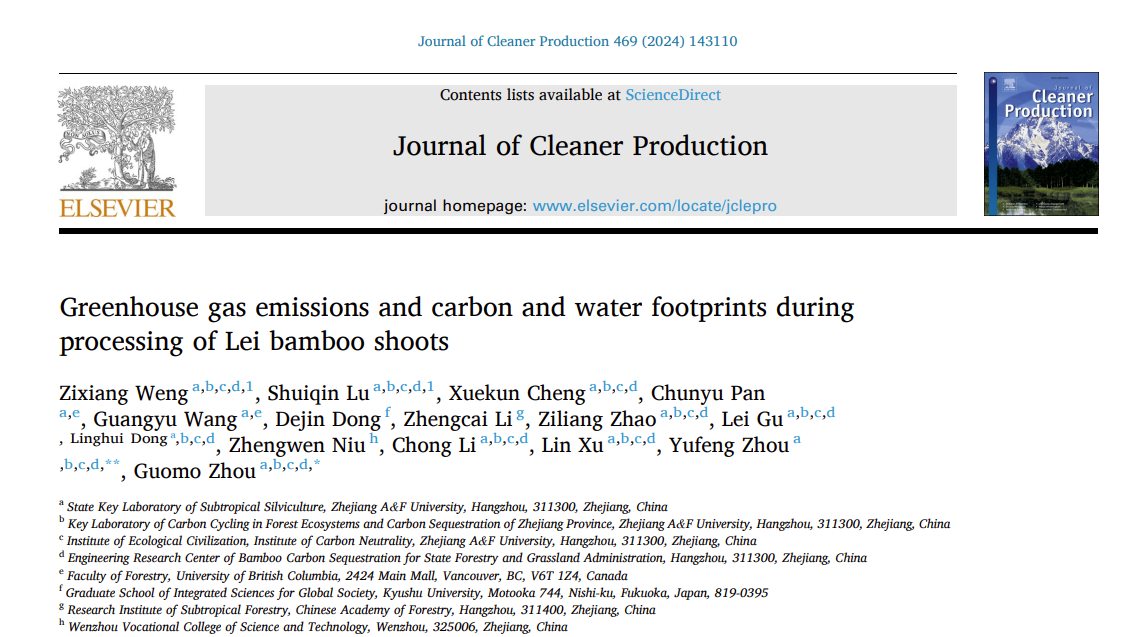 近日,環境與資源學院、碳中和學院地理信息科學專業2022級本科生翁子翔,以第一作者在國際著名期刊《Journal of Cleaner Production》(中科院一區Top,IF5=10.2)上發表題為《雷筍竹加工過程中的溫室氣體排放和碳水足跡》(Greenhouse gas emissions and carbon and water footprints during processing of Lei bamboo shoots)的研究論文。環資院、碳中和學院周宇峰,周國模教授為通訊作者,碩士研究生陸水琴、程學琨,本科生趙梓喨,加拿大不列顛哥倫比亞大學(UBC)博士生潘春豫等參與其中。