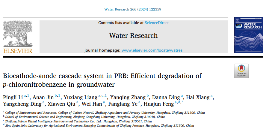 9月2日,環境與資源學院、碳中和學院馮華軍教授領銜的ZAFU環境修復與生態健康團隊在國際頂尖的水資源研究領域專業期刊《Water Research》(中科院一區Top,IF=11.4)上發表題為《PRB中的生物陰極-陽極級聯系統:高效降解地下水中的對氯硝基苯》(Biocathode-Anode Cascade System in PRB: Efficient Degradation ofp-Chloronitrobenzene in Groundwater)的研究論文。浙江農林大學為該論文的第一通訊單位,環境與資源學院、碳中和學院馮華軍教授為該論文的通訊作者。