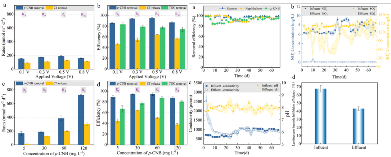 對氯硝基苯(p-CNB)是一種用于生產殺蟲劑、除草劑、染料和各種工業化學品的重要合成中間體,會引起高鐵血紅蛋白血癥、溶血性貧血、肝病和神經損傷等疾病,在地下水中被廣泛檢測到。例如Fenton等傳統處理工藝,處理地下水中p-CNB通常存在修復成本高、二次污染重、環境風險大等問題。滲透性反應屏障(PRB)是一種地下水污染物修復的主流技術,但因它容量有限,無法持續去除污染物。生物電化學系統(BES)是一種以清潔電能作為驅動力,強化微生物氧化或還原有機污染物的新興生物處理技術,特別是對于類似p-CNB等需要協同還原-氧化作用才能降解的污染物具有很好的去除性能。